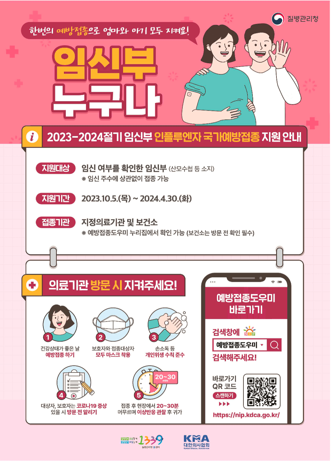 (2010.1.1.~2023.8.31. 출생)2회 접종 대상자 2023년 9월 20일 ~ 2024년 4월 30일 1회 접종 대상자 2023년 10월 5일 ~ 2024년 4월 30일 임신부 2023년 10월 5일 ~ 2024년 4월 30일 65세 이상 어르신 75세 이상